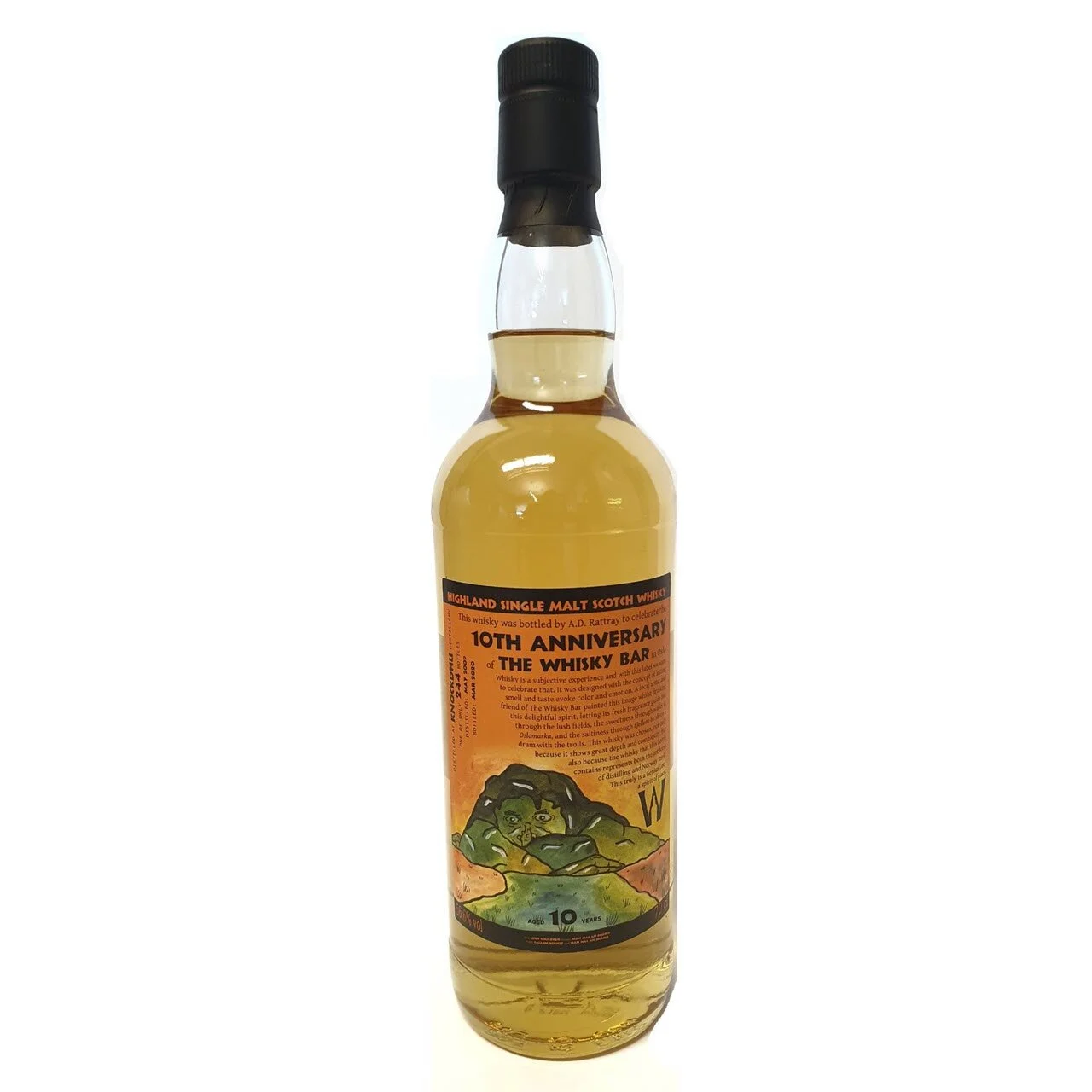 Here is another whisky recently bottled exclusively for The Whisky Bar in Oslo, to celebrate their 10th Anniversary. The Knockdhu 2009 10 YO “10th Anniversary of The Whisky Bar” was distilled in May 2009, and bottled in March 2020. This is a single cask release (cask #700308) bottled by independent bottler A. D. Rattray. The total outturn was 244 bottles.