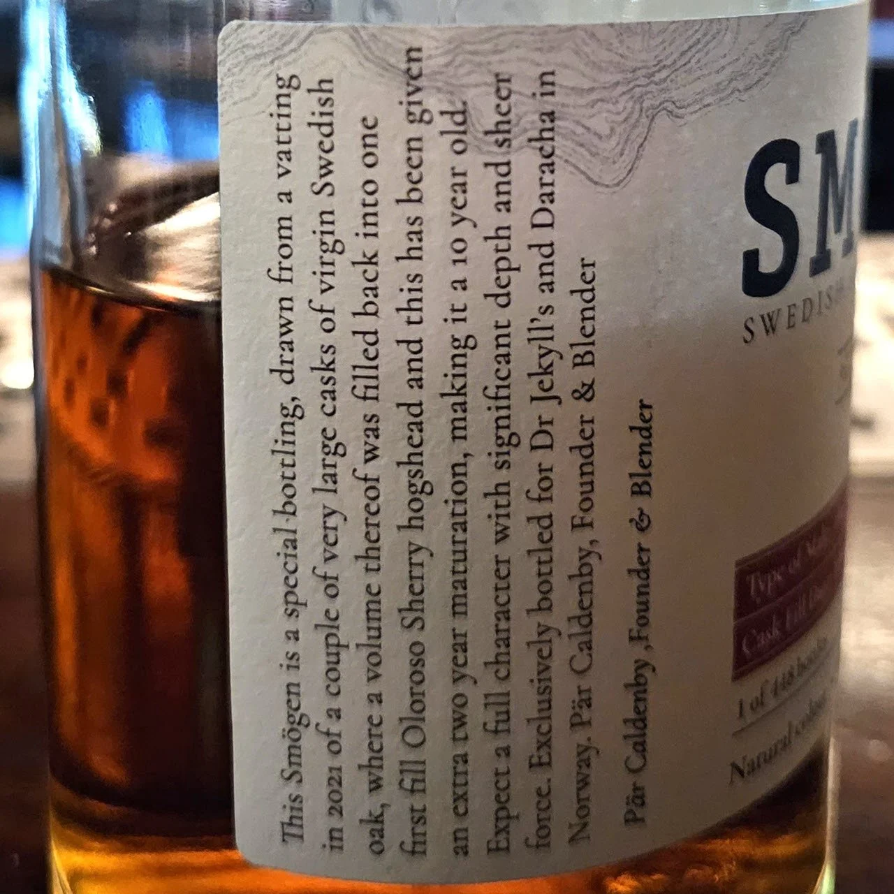 Ooh, I approach this whisky with a certain mix of trepidation and expectation. It is a Smögen, which under normal circumstances is a guarantee for high quality, then again it has been mainly matured in virgin Swedish oak, which is a massive red flag - at least to me. I am jumping the gun a bit though. Let me get the facts on the table, and then dive deep into the whisky (almost) literally. Then we shall see. To be fair, this whisky has been finished in something else, which will hopefully take the edge off the “dreaded” virgin Swedish oak.