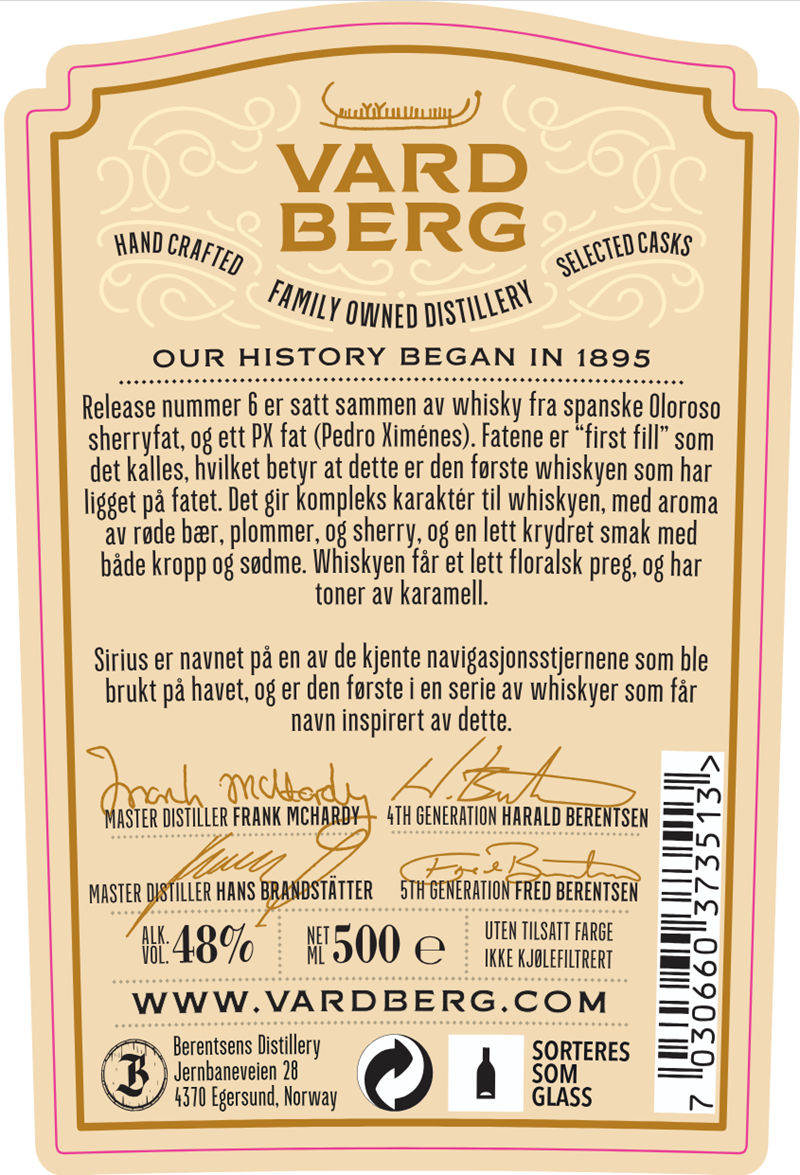 This is the sixth single malt whisky released by Berentsens Distillery, Norway. This whisky has been matured in a combination of several 1st fill ex-Oloroso sherry casks and one 1st fill ex-PX sherry cask. This is a limited release of 1950 bottles.